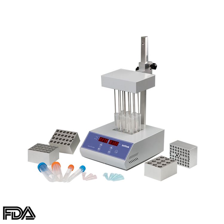 NEC160-1 Nitrogen Evaporator/ sample concentrator is with microprocessor controlled and PID fuzzy controlled technique. Instead of traditional water bath device, the heat-conducting medium is high purity aluminum. The test tubes are held in a block, and blowing a large number of samples at one time. It can used in residue analysis, commodity inspection, food, environment, pharmacy and biological product and other industries.
